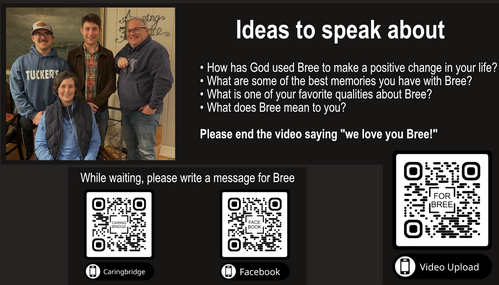 We're collecting video messages of encouragement and love for Bree Banks as she continues to live with stage 4 cancer. Upload your own (use the "Learn More" button or the QR code below), or we'll have a camera set up at TBC on Sunday, March 29.